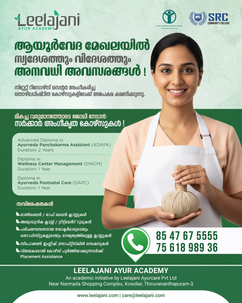 All courses at Leelajani Ayur Academy are approved by the State Resource Centre (SRC), Kerala, an official resource institute under the Government of Kerala. This approval ensures that every program follows structured guidelines, maintains high academic standards, and offers certifications that are valued in Ayurveda hospitals, wellness centers, and therapy clinics.